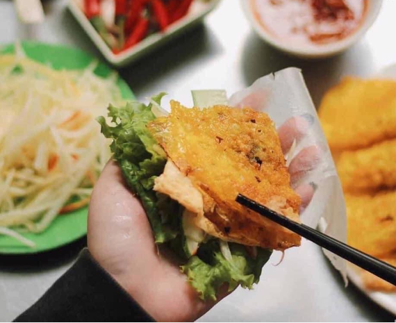 Lớp bỏ bên ngoài giòn, nhân bên trong là hỗn hợp tôm, thịt, giá đỗ. Bánh ăn kèm rau sống cuốn bánh tráng và chấm kèm nước chấm chua ngọt cứ phải gọi là “ngon nhức nách”. Với sự hòa hợp trong hương vị mà bạn có thể ăn mãi mà không thấy ngán.
