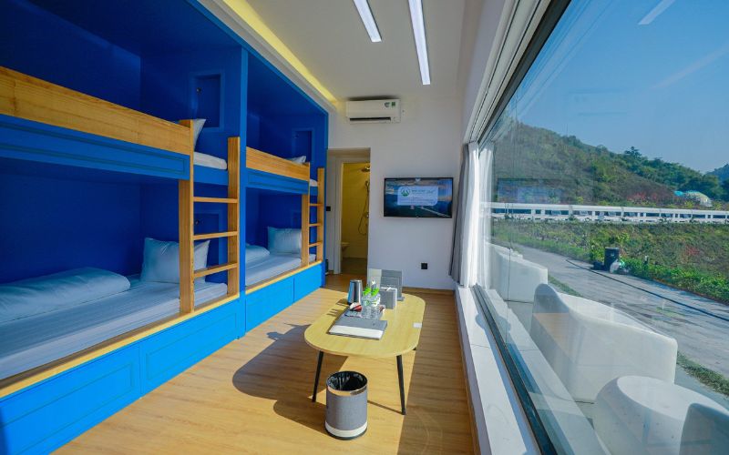 Không gian bên trong khách sạn được thiết kế mở, nhiều khoảng view thoáng đãng giúp du khách chiêm ngưỡng trọn vẹn vẻ đẹp của thung lũng. Các hạng phòng đa dạng, từ Pullman VIP sang trọng, Couchette tiện nghi đến những căn capsule nhỏ gọn, phù hợp cho mọi nhu cầu.