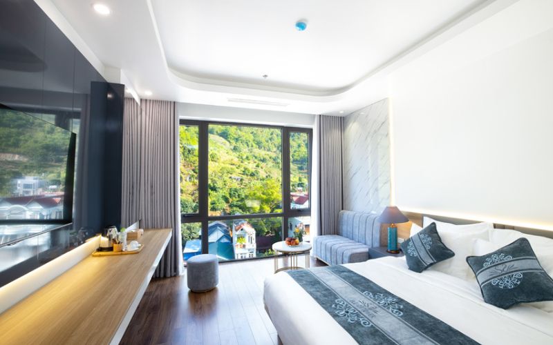 Khách sạn cao 8 tầng với 169 phòng nghỉ dưỡng cao cấp, mỗi phòng đều được trang bị đầy đủ tiện nghi hiện đại, cửa sổ lớn mở ra khung cảnh núi non hùng vĩ hoặc thị trấn yên bình. Đặc biệt, hồ bơi ngoài trời, spa, phòng gym, sân tennis và nhà hàng phục vụ ẩm thực đặc sản địa phương khiến kỳ nghỉ của bạn trở nên trọn vẹn. Với vị trí ngay trung tâm, từ khách sạn, bạn chỉ mất vài phút để đến đồi chè trái tim, rừng thông bản Áng hay thác Dải Yếm thơ mộng.